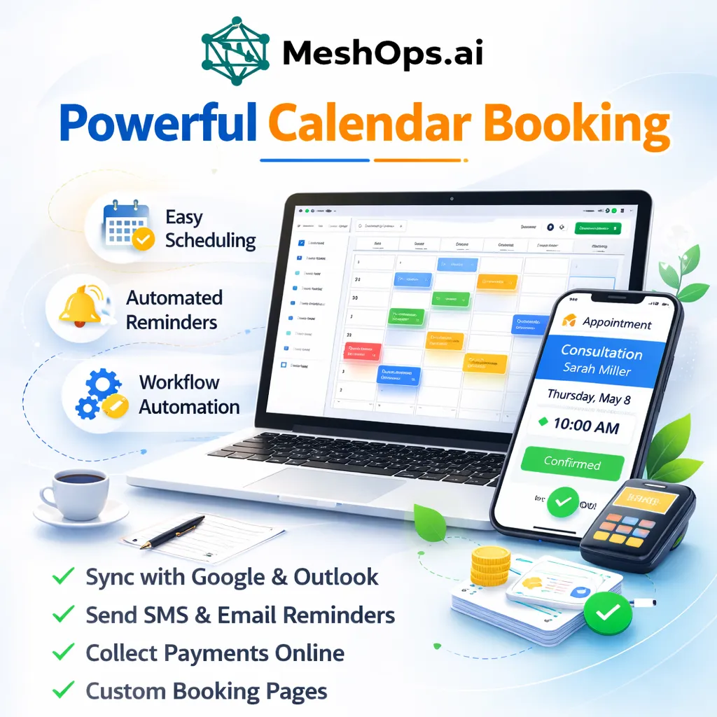 MeshOps's Calendar is a powerful tool that goes far beyond simple appointment booking. It solves major business challenges like missed opportunities, no-shows, scheduling chaos, and disconnected systems.